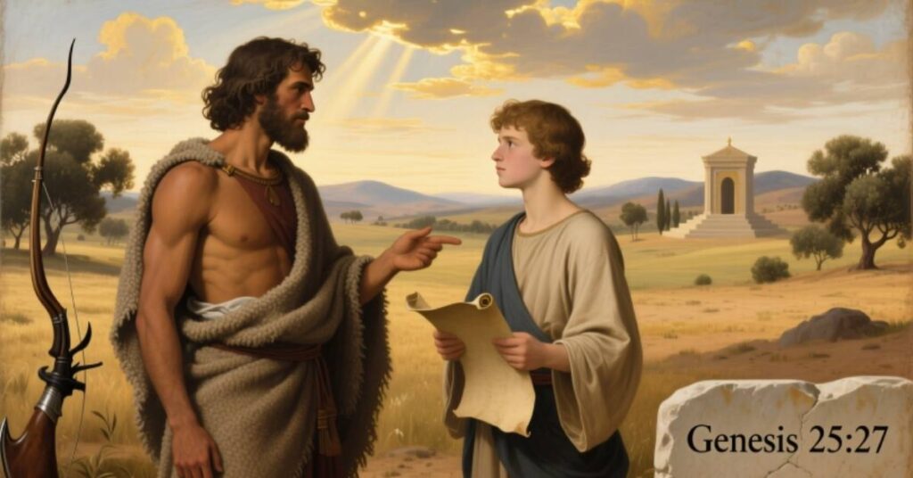 “When the boys grew up, Esau became a skillful hunter, a man of the field, while Jacob was a quiet man, dwelling in tents.”